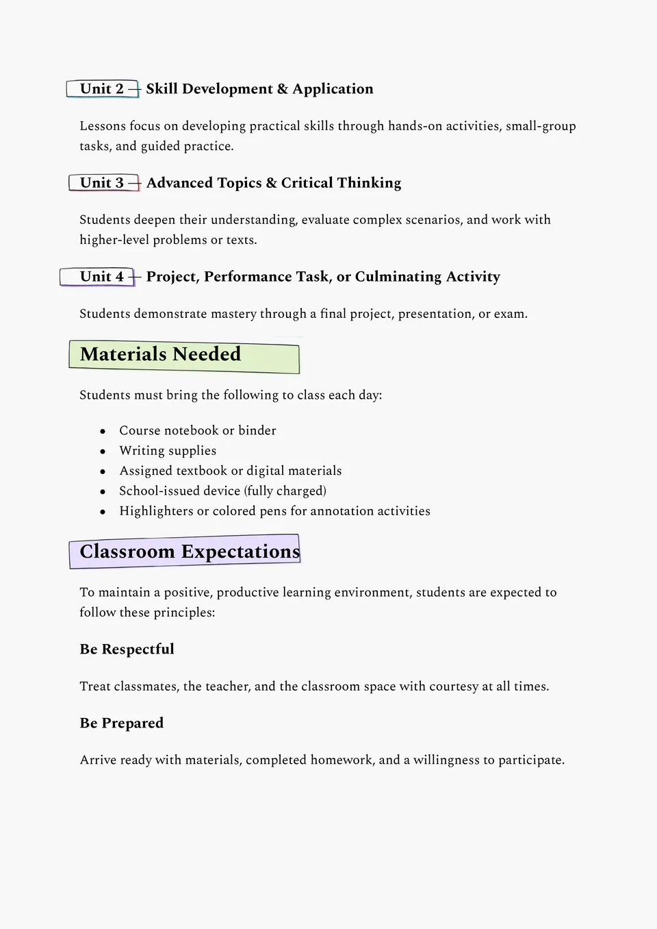 The High School Class Syllabus Template gives you a structured way to present assignments, standards, and timelines to older students. It includes sections for class goals, materials, grading, and weekly topics.