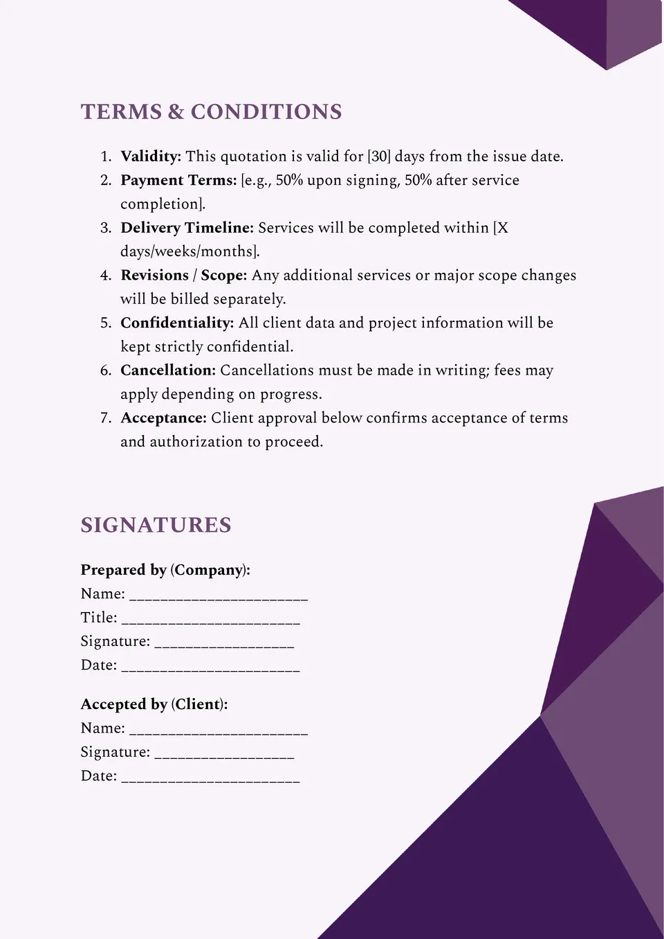 The Cleaning Quote Template helps your cleaning business offer transparent, professional quotes for recurring or one-time services. With editable fields for tasks, frequency, pricing, and terms, it’s great for home or commercial cleaning providers.